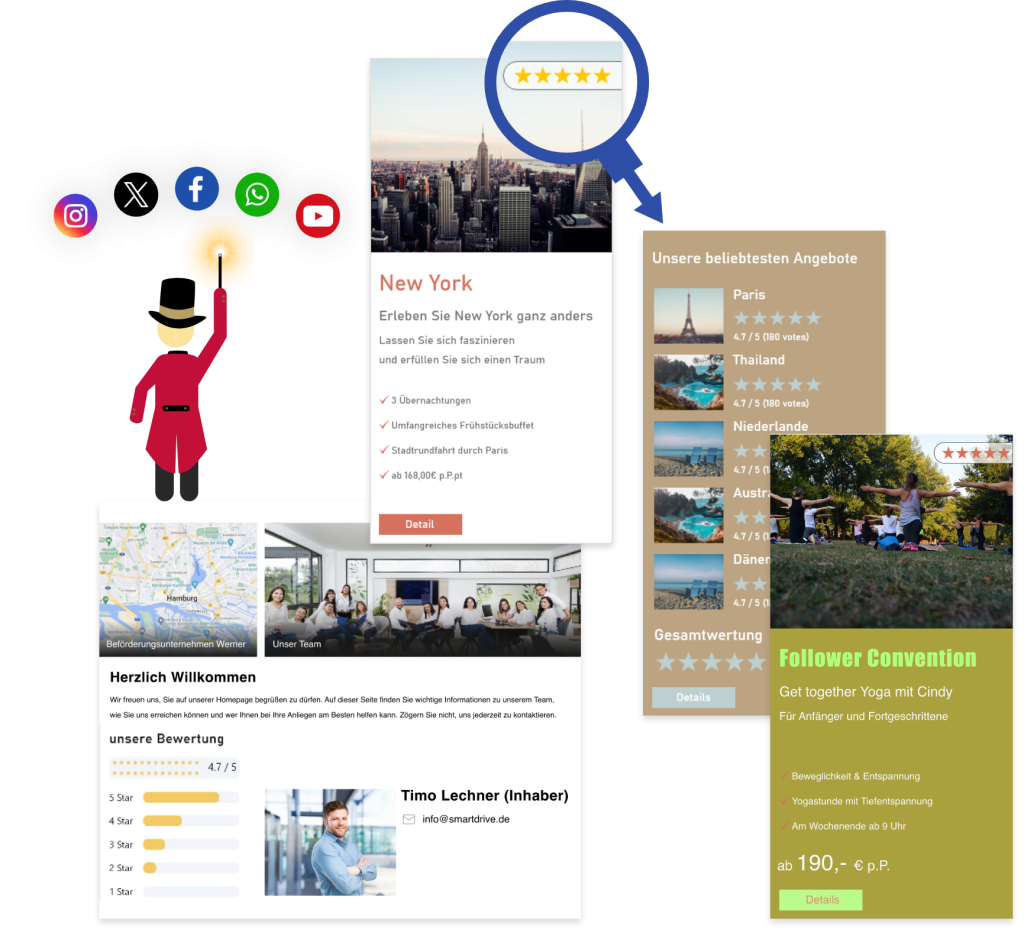 Mit unserem Social-Media-Wizard pushen wir positive Bewertung,- Ihren Content nach Ihren Vorgaben in alle gewünschten Vertriebs- & Social-Media-Kanäle.